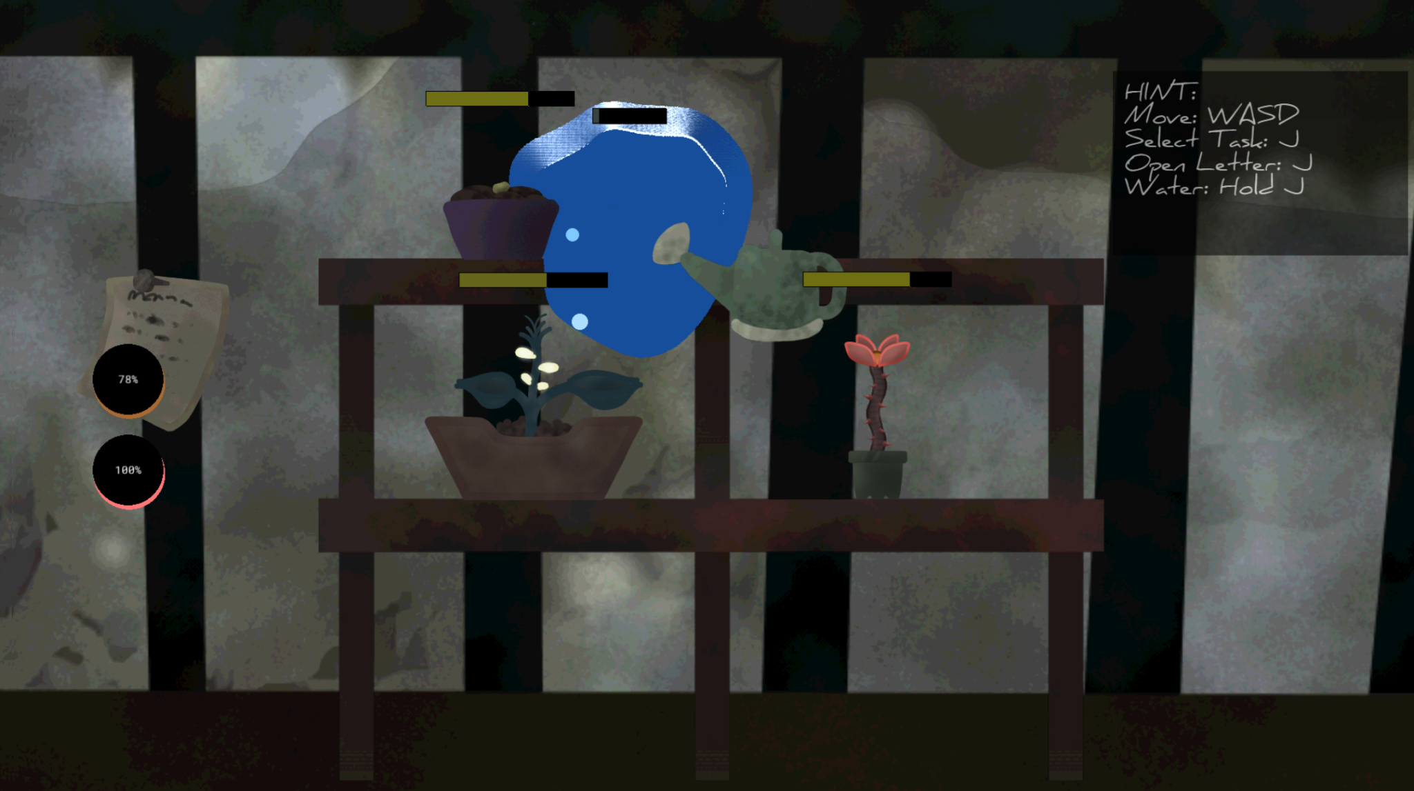 Water: Hold J to push and drag up from the bottom to push water through the plant veins. Return to the staging and let the water drip into the watering can!
